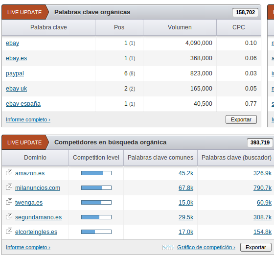 Palabras clave de posicionamiento orgánico para ebay.es y competidores en búsqueda orgánica.