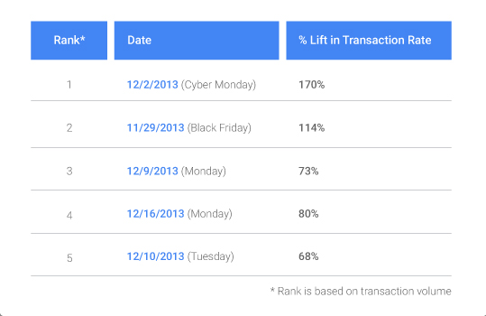 Como es una estrategia online, los dueños de los ecommerce tienen que ser concientes de la existencia del Cyber Monday en España, el 1 de diciembre, es el día de rebajas de Internet de todo el año por antonomasia, se podría decir que marca el inicio de las compras de Navidad y cuando se generan el mayor número de transacciones. En algunos ecommerce la tasa de conversión fue un 170% más alta que la media.