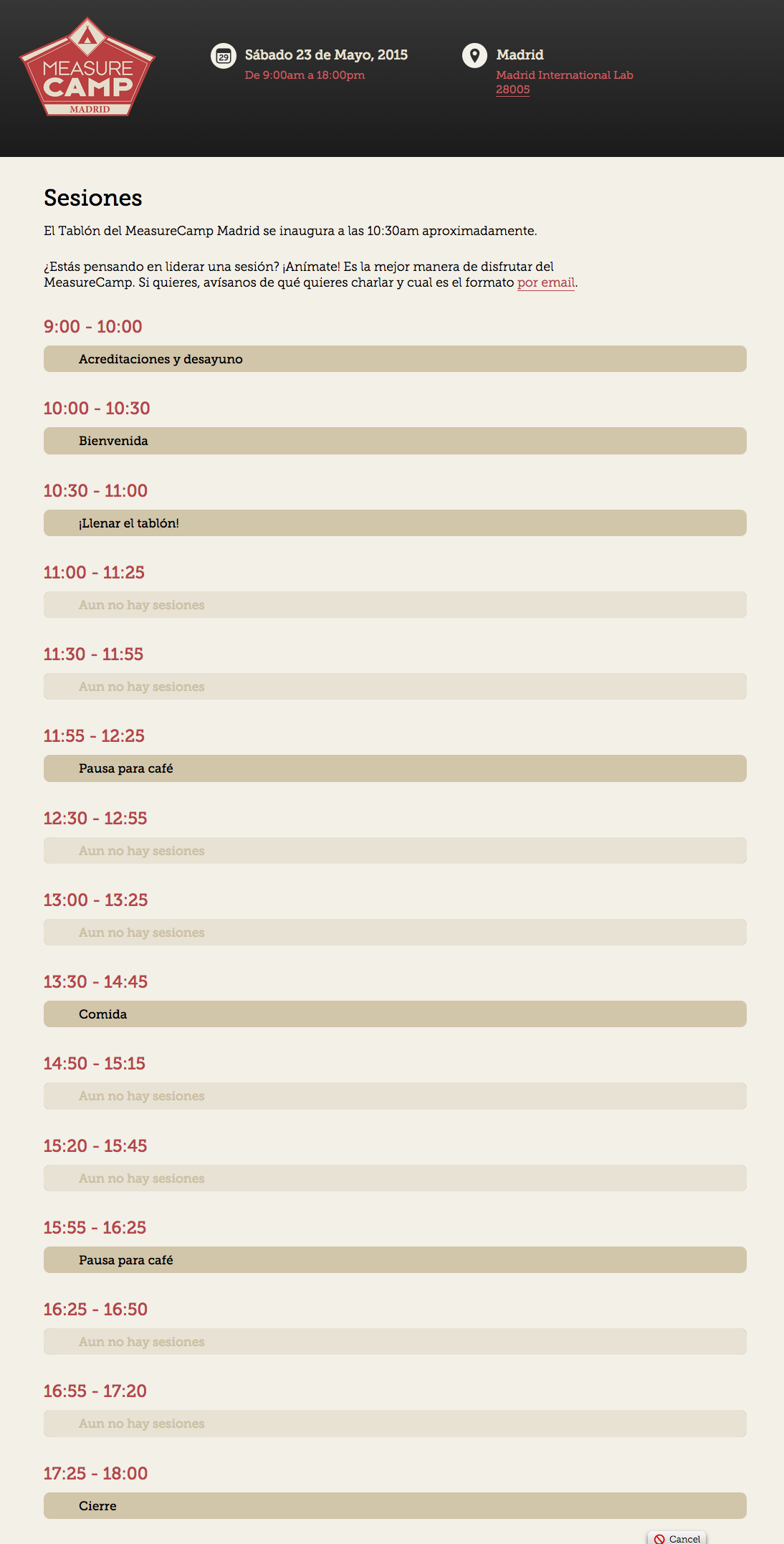 Si llegáis a la Measure Camp con ganas de aportar algo, tendréis que rellenar una ficha con el título, nivel de dificultad y formato de vuestra intervención (taller, ponencia, discusión) y podéis completarlo con algún comentario que ayude a entender vuestra sesión.