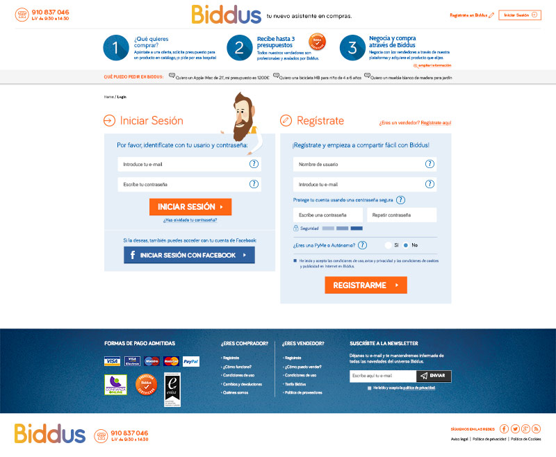 Además del papel que cumplen en la home, la web está salpicada de estos personajes en los registros de usuarios y de vendedores, en algunas llamadas a la acción o en las imágenes genéricas de producto, reforzando así el estilo de esta web y la línea de diseño de Biddus.