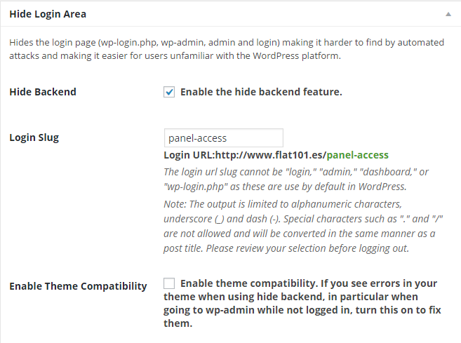 La opción mas importante sin duda para la protección contra ataques por fuerza bruta consiste en cambiar la url de login de nuestro WordPress, de forma que directamente solo los que conozcan la url podrán loguearse. Os recomiendo que introduzcáis un nombre único y con el que estéis cómodos.