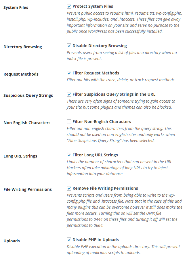 Para finalizar de configurar el plugin, activaremos otras medidas de seguridad no menos importantes, como evitar que se listen los ficheros de nuestras carpetas, bloquear urls sospechas, no ejecutar PHP en el directorio uploads de WordPress, etc.