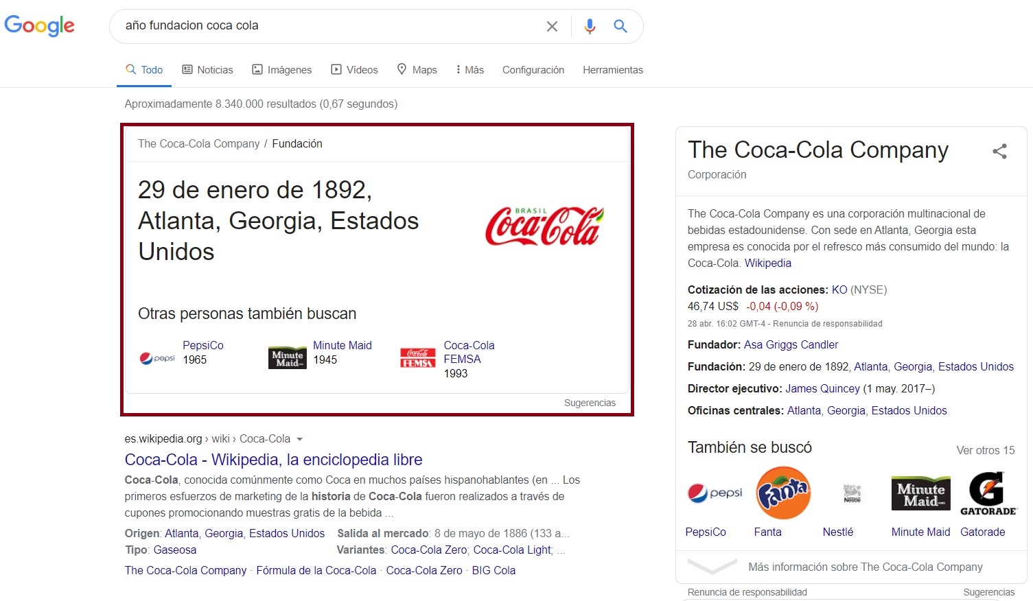 Las Knowledge cards admiten resultados extraídos directamente de las webs y de las fichas de Google My Business (de las que hablaremos más adelante), no solamente de las páginas de Wikipedia, como ocurre con los knowledge graphs. Se trata de respuestas rápidas y breves que concede Google, pero que, a diferencia de los knowledge graphs, no tienen un enlace a la página para ampliar la información -es decir, un enlace a la página de Wikipedia como tal-. Sin embargo, esto no representa ningún impedimento para que podamos trabajar en nuestros sites y en nuestras fichas de Google My Business para dar respuesta a ciertas consultas de los usuarios, amén de en nuestras páginas de Wikipedia como hemos visto en la sección anterior.