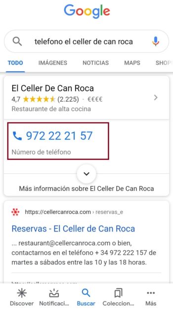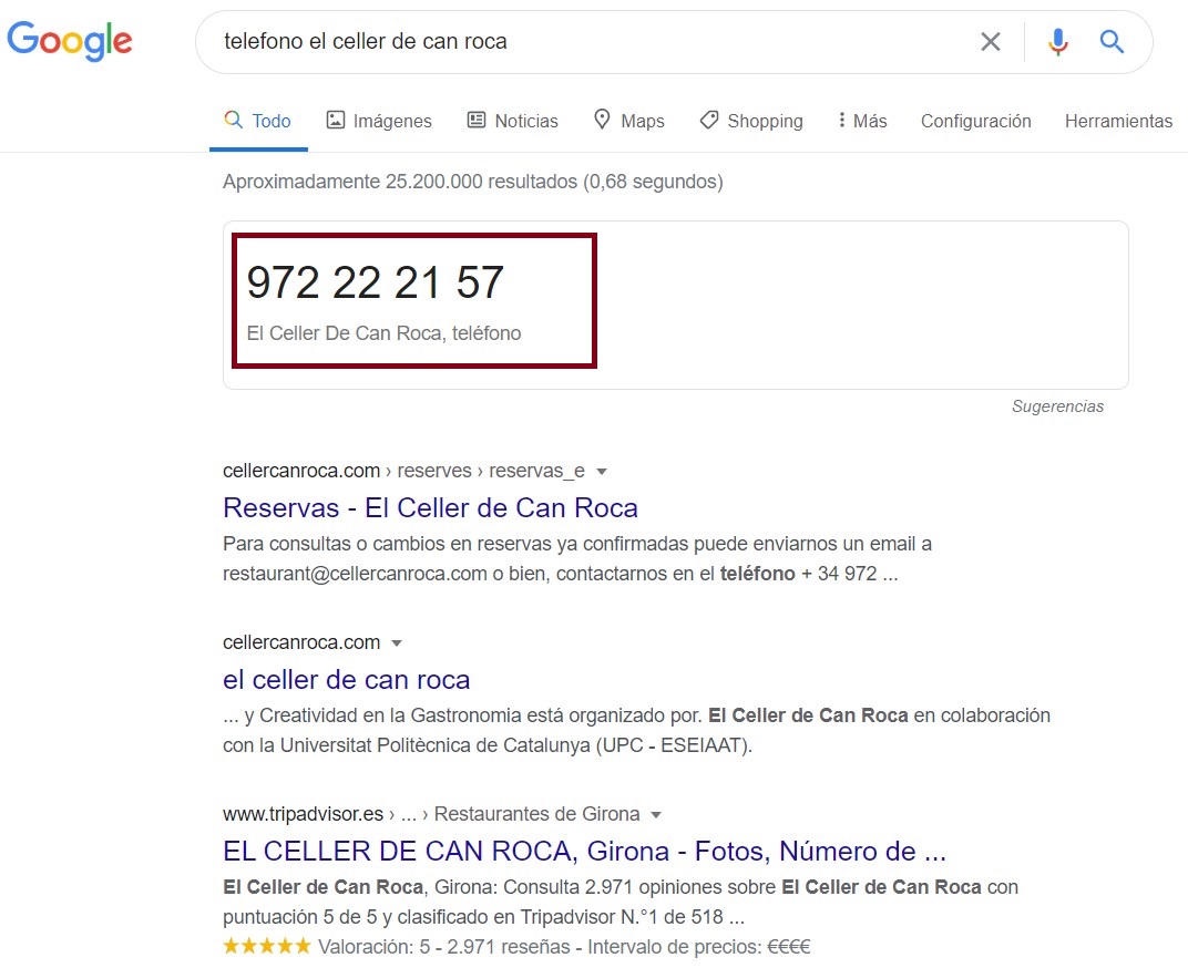En versión de escritorio se vería así (lo que nos invita a pensar que también extrae la información de una web, dado que no aparece el enlace de “Más información sobre El Celler De Can Roca” que lleva a la ficha de Google My Business correspondiente):