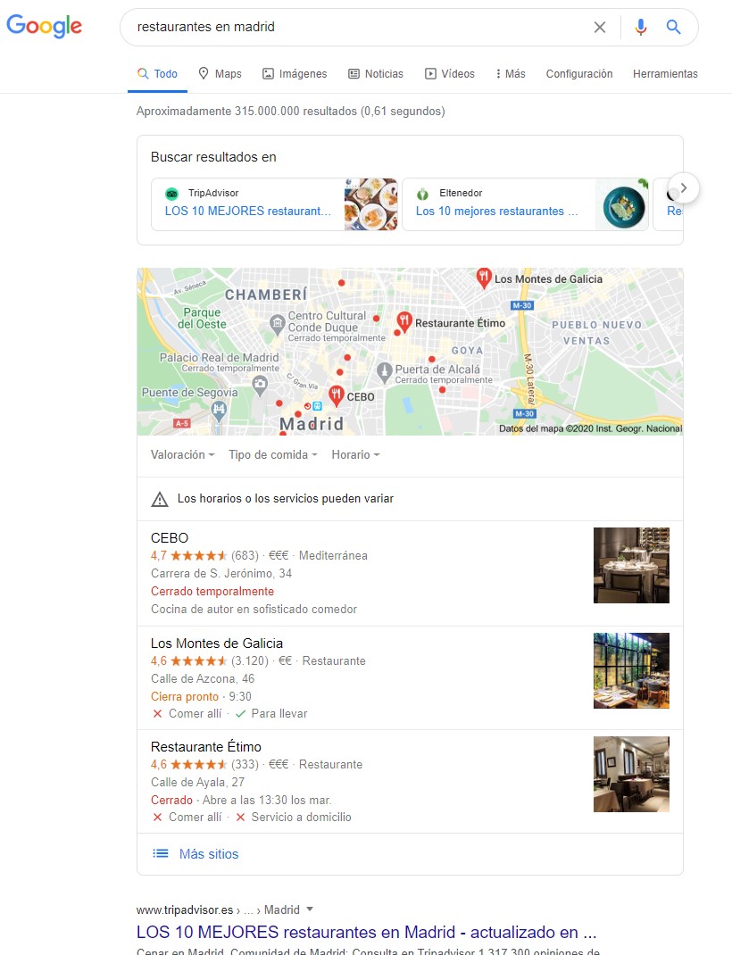 Los negocios físicos tienen aquí, no una oportunidad, sino una obligación. Hace tiempo que Google empezó a mostrar en la parte superior de su página de resultados fichas de negocio, denominadas fichas de Google My Business, asociadas a Google Maps en el caso de búsquedas geolocalizadas, independientemente de que el usuario especifique la localización en su búsqueda (por ejemplo, “restaurantes en madrid”) o no (“restaurantes” a secas, pero con la función de geolocalización o detección de la ubicación del teléfono móvil activada):