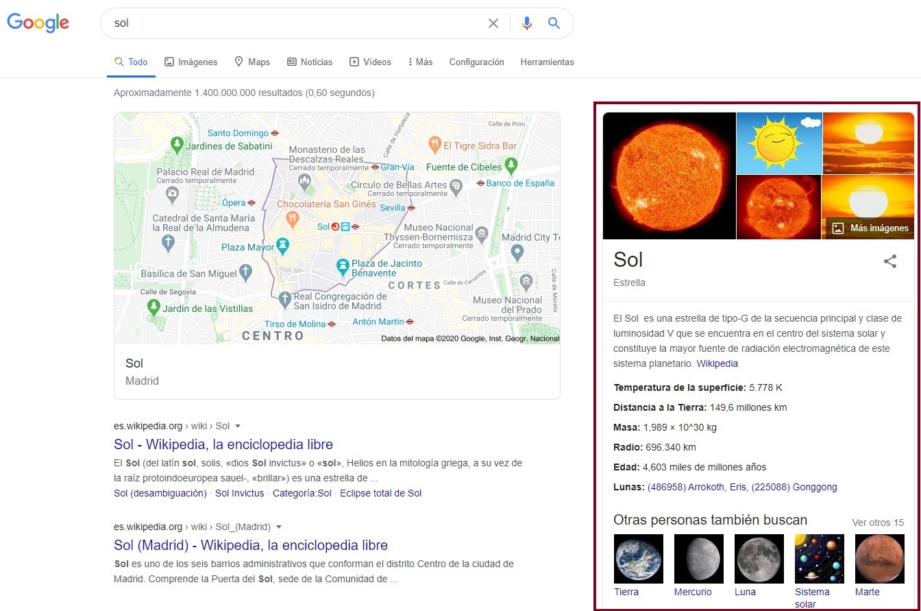 Aunque aparecer en este tipo de resultado no depende directamente de nosotros, al menos sí podemos hacer todo lo que esté en nuestra mano. Los Knowledge graphs son paneles con contenido que Google extrae de las páginas de Wikipedia y que muestra en el lateral derecho superior de la página de resultados: