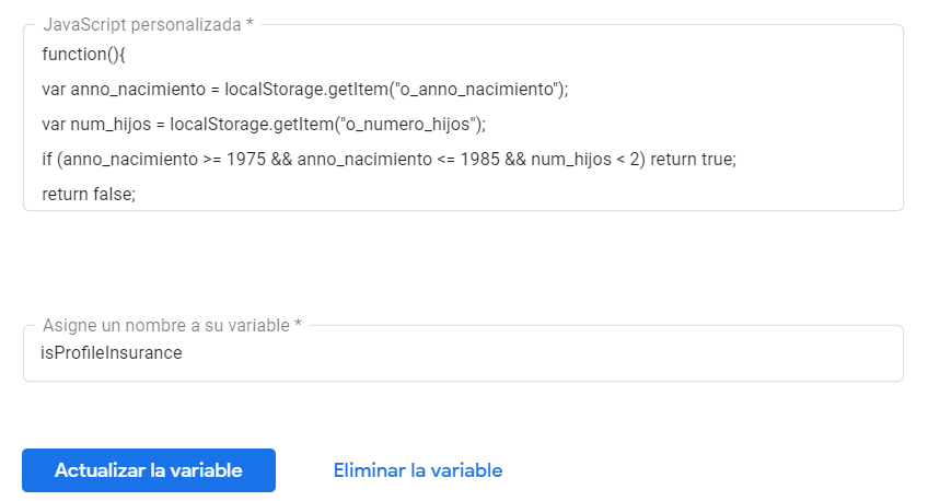 Se hizo un estudio previo para poder categorizar a los usuarios en función de los datos que rellenaban a lo largo del funnel de contratación, con los datos que rellenaban podíamos agruparlos en diferentes perfiles. Para que esa información esté disponible en Google Optimize y poderla utilizar, podemos guardarla en el navegador del usuario, por ejemplo en el localStorage.