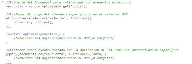 Solución: configurar los momentos de carga del experimento de manera que tengamos acceso al código del framework SPA y sobreescribir el comportamiento por defecto. Requiere de una comunicación ágil y fluida con el departamento técnico del cliente. Añadir el siguiente código JS (pseudocódigo) en cada variante del experimento: |