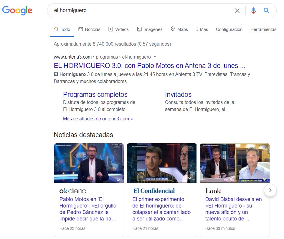 Se trata de un bloque de artículos relevantes para la búsqueda del usuario que aparece en la mitad superior de la página de resultados. No tienen por qué ser solamente noticias de medios de comunicación generalistas las que aparecen aquí; también son susceptibles de aparecer artículos de medios especializados y de blogs: