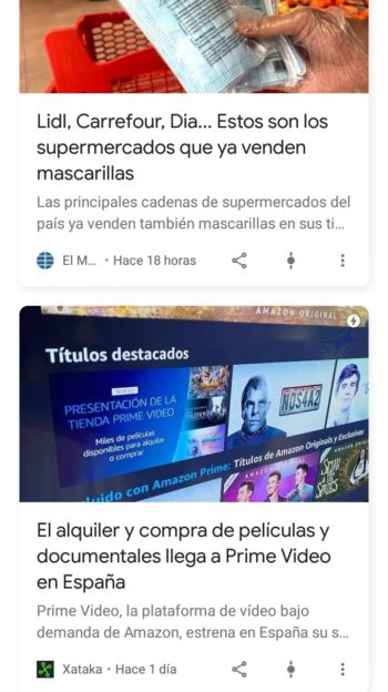 Se trata de una plataforma, sólo disponible en dispositivos móviles, muy poderosa que cada vez se está consumiendo más. La idea es muy sencilla: Google muestra contenido que se adapta a los gustos, preferencias e inquietudes del usuario. Y aquí entra de todo: noticias, posts, vídeos, fichas de producto… ¿Y cómo consigue saber Google que nos gusta un determinado contenido o temática? Básicamente, a través de nuestra navegación y las búsquedas que hacemos en el buscador, aunque también entran temáticas de actualidad: