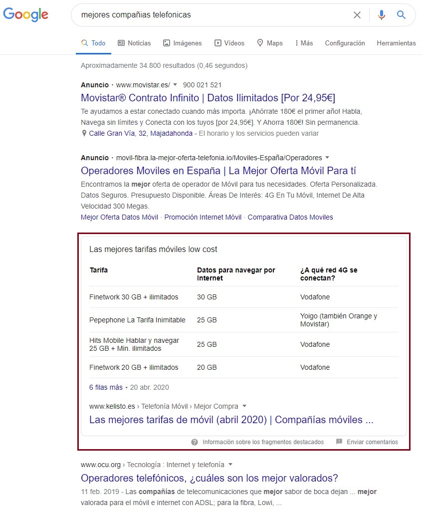 - En modo tabla: Cuando el contenido ofrezca la oportunidad y sea susceptible de presentarse en una tabla, lo mejor es organizar el contenido en una tabla en HTML, en lugar de en texto plano, utilizando las etiquetas <table>, <tr>, <th> y <td>. Aumentaremos nuestras probabilidades de aparecer como fragmento destacado o en posición 0: