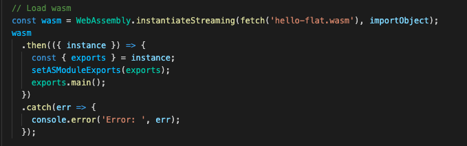 Necesitaremos un código Javascript que cargará nuestro wasm y comunica el ejecutable con la API del navegador