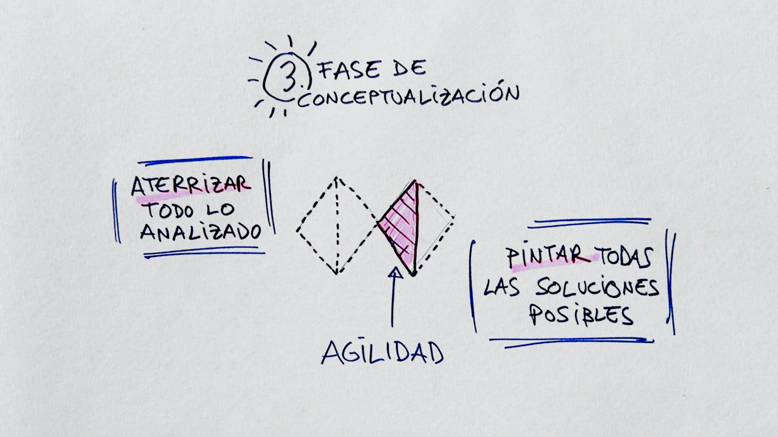 Empezamos el segundo diamante, en esta tercera fase es donde más potente es prototipar en papel, listaremos todos los problemas detectados para empezar a diseñar soluciones. Qué mejor que poder juntarse con todos los equipos implicados y rápidamente abocetar, recortar, pintar, tachar… para tener una vista general de todos los flujos que queremos optimizar.
