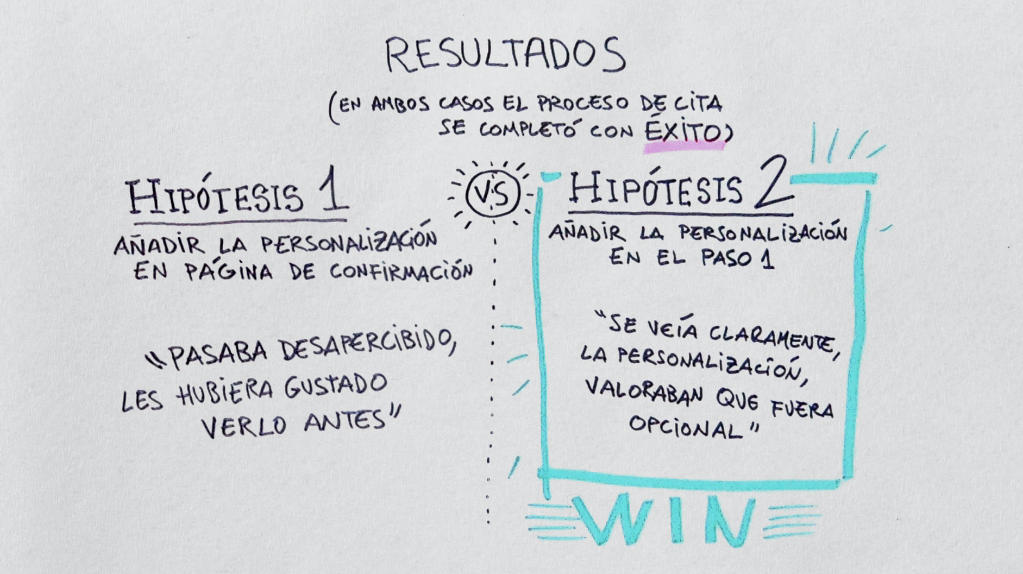 Gracias al prototipado en papel, pudimos testar varias hipótesis rápidamente con las usuarias, en este caso era una cuestión de posición de contenido, las usuarias dieron por ganadora la Hipótesis 2, les pareció mucha más personalizada esta opción ya que posicionando este contenido en la página del formulario era más visible y el flujo de información se percibía mejor.