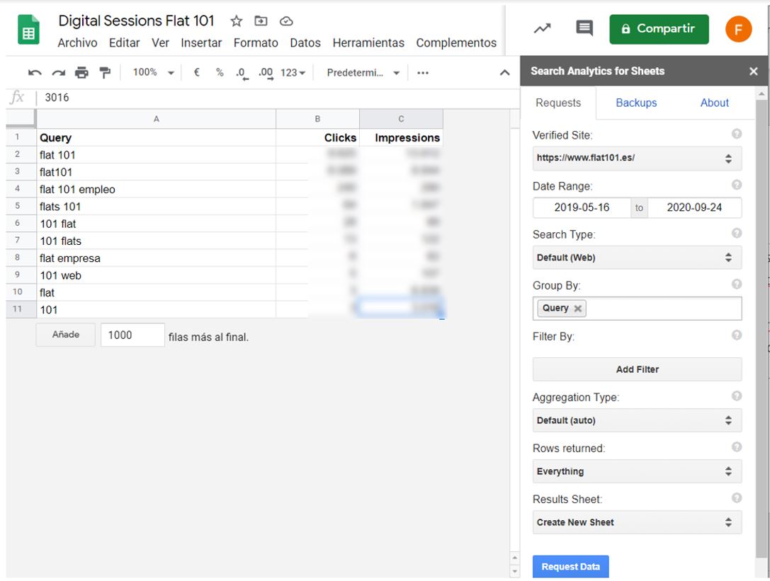 2. Otra opción es utilizar un complemento para Google Sheets como Search Analytics for Sheets para extraer los datos directamente a una hoja de cálculo, filtrando los datos por fechas, tipo de búsqueda, etc.
