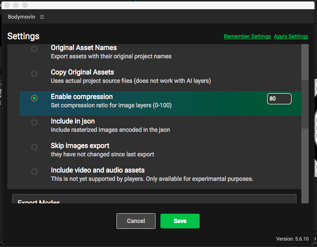 Recordemos que, si nuestra composición contiene imágenes de información de píxel o capas de texto, será necesario ajustar en setting para que el Lottie se exporte de forma correcta (activar la opción de “Glyphs” para capas de texto, “Include in JSON” para las imágenes de píxel…).