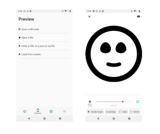 - A través de la App de Lottie: Si tenemos la posibilidad de pasar los archivos Lottie a nuestro móvil y verlos desde la App, obtendremos una mayor fidelidad de cómo se visualiza a sobre de iOS o Android. También existe la posibilidad de escanear con la App el código QR que nos facilita la preview de Lottiefiles.com, de tal forma que podremos hacer el mismo testeo sobre dichos sistemas operativos.