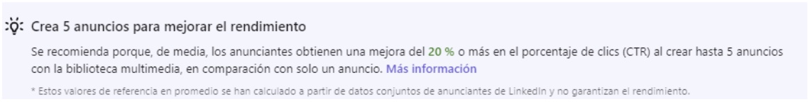 En primer lugar, hay que tener en cuenta el número de creativos recomendados por campaña. LinkedIn Ads ha pasado de recomendar un mínimo de 3 piezas en rotación a alcanzar un mínimo 5 creativos en rotación por campaña, independientemente del presupuesto disponible o periodicidad de la campaña.  Cada creatividad debe ser ligeramente diferente entre ellas, ¿cómo? pues a través de las imágenes empleadas y los mensajes transmitidos en los campos de copy, descripción y título.