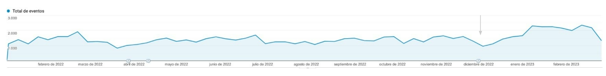 Analizando la página del blog con más tráfico se aprecia un aumento del 84,35% del número de veces que se ha cumplido el evento principal desde que se desactivan las páginas AMP en noviembre de 2022: