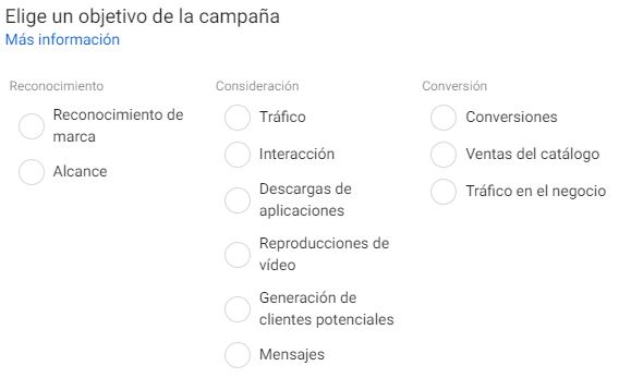 Facebook Ads nos da la posibilidad de focalizar en nuestro objetivo, de tal manera que indicaremos a la plataforma qué debe optimizar. Estos objetivos están centrados en cubrir las diferentes fases del funnel de conversión.