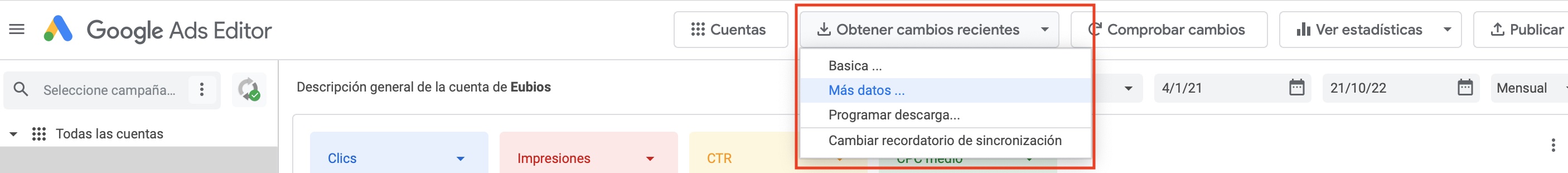 ¡Consejo! Cada vez que vayamos a utilizar Google Ads Editor es recomendable descargar los cambios recientes, seleccionando la opción “Más datos…”, aunque esta opción es más lenta que la opción “Básica…”