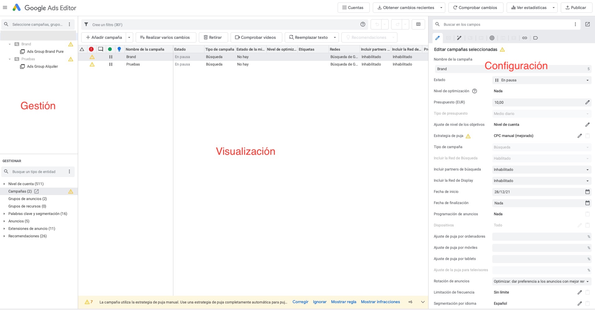 La segunda parte de la interfaz del Google Ads Editor, la hemos llamado “visualización”. Lo que veamos en ella, dependerá de nuestra selección en “Gestión”.