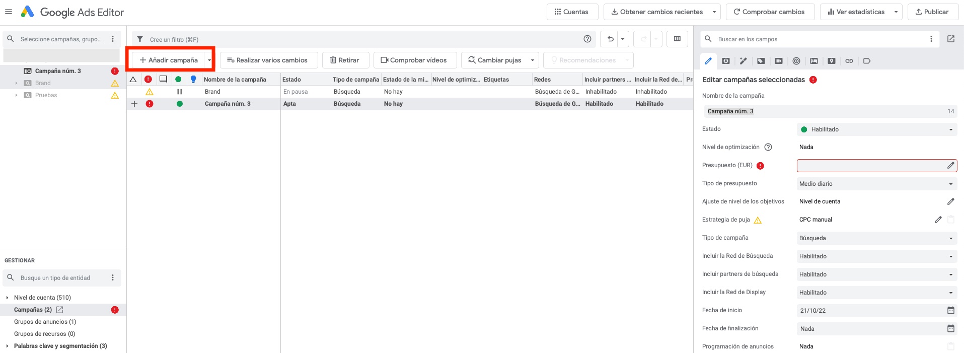 Hasta aquí hemos podido ver cómo crear nuestra primera campaña en Google Ads Editor. Podemos hacer un sinfín de acciones más en esta herramienta. Hay que pensar que es como un enorme excel en el que podemos copiar, cortar y pegar, por eso, antes de empezar a realizar cambios masivos es bueno probar diferentes acciones.