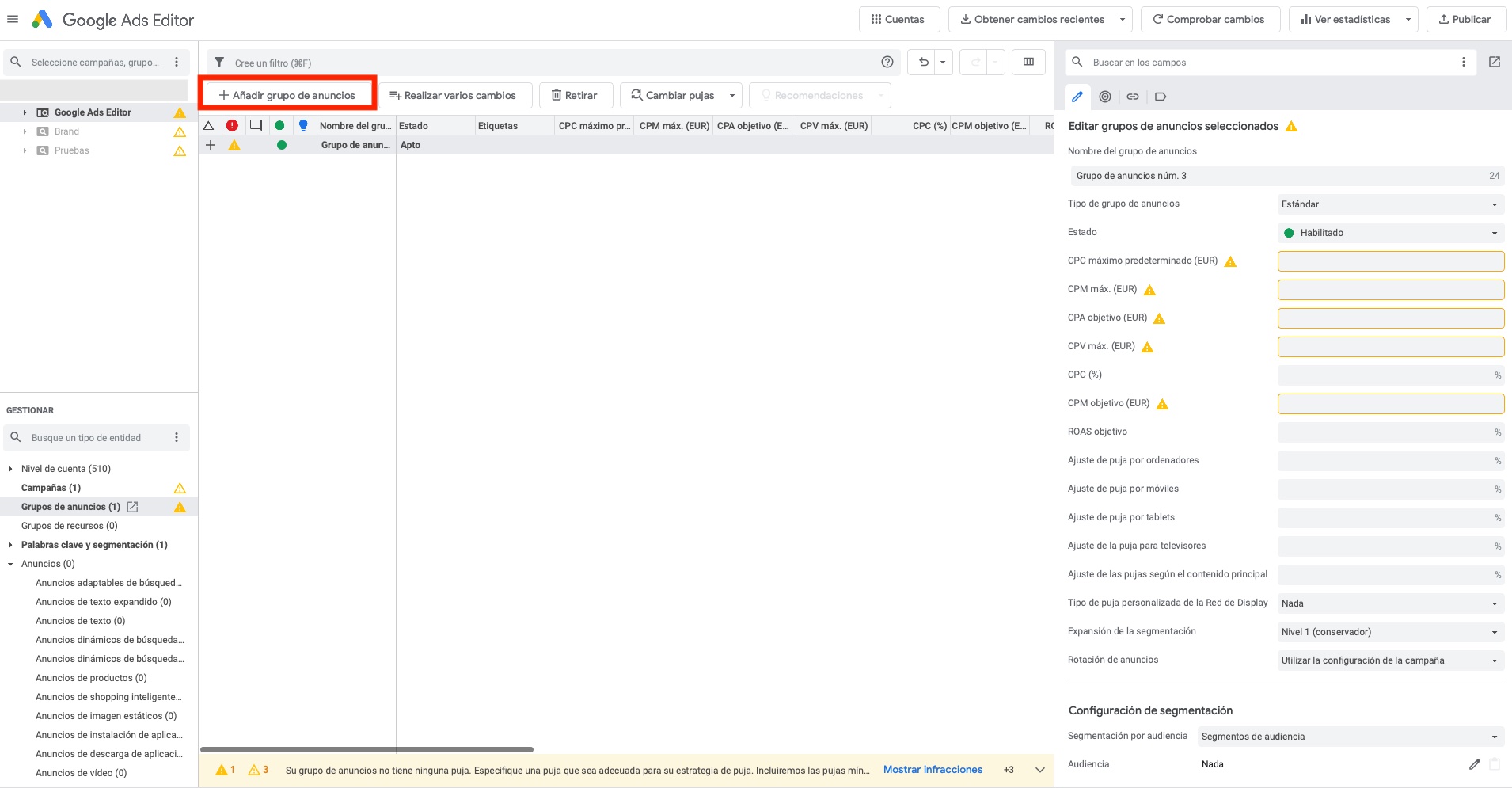 Ahora vamos a configurar los grupos de anuncios. Con la campaña nueva seleccionada, le daremos a “añadir grupo de anuncios” y después en la parte de “configuración” aplicaremos los cambios deseados.